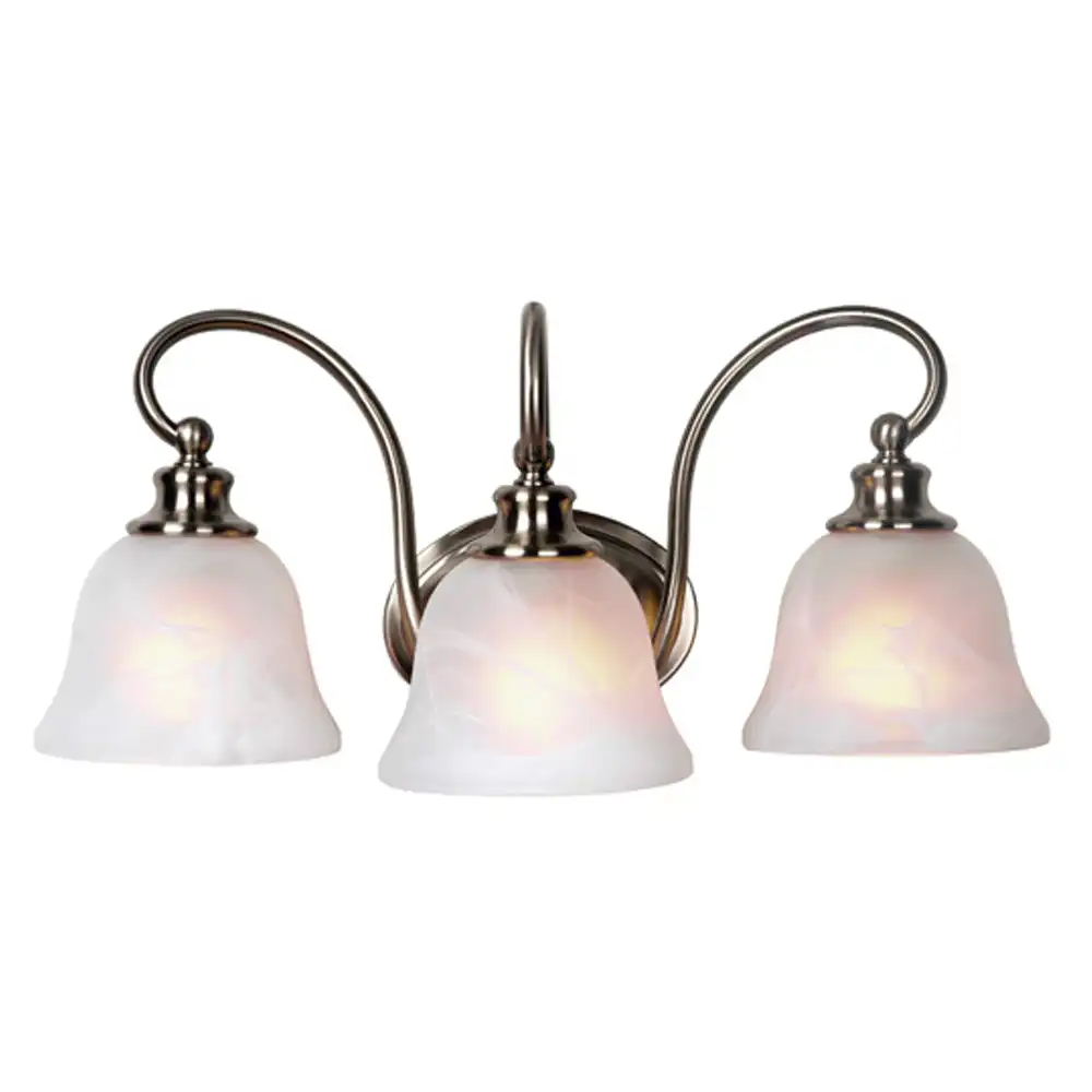 This three-light wall fixture is constructed from robust, high-strength metal, ensuring a stable and sturdy structure that is built to withstand the test of time. The distinguished brushed nickel finish offers a clean, contemporary, and slightly subdued aesthetic that complements a wide range of color palettes and modern design schemes. This elegant finish, combined with the gracefully curved arms and a classic circular backplate, creates a timeless and inviting presence. Three bell-shaped faux alabaster glass shades, which diffuse light softly and evenly, casting an inviting, ambient glow perfect for vanity areas, master bathrooms, or as an accent in hallways. The natural-looking subtle veining in the glass adds to its refined appeal.