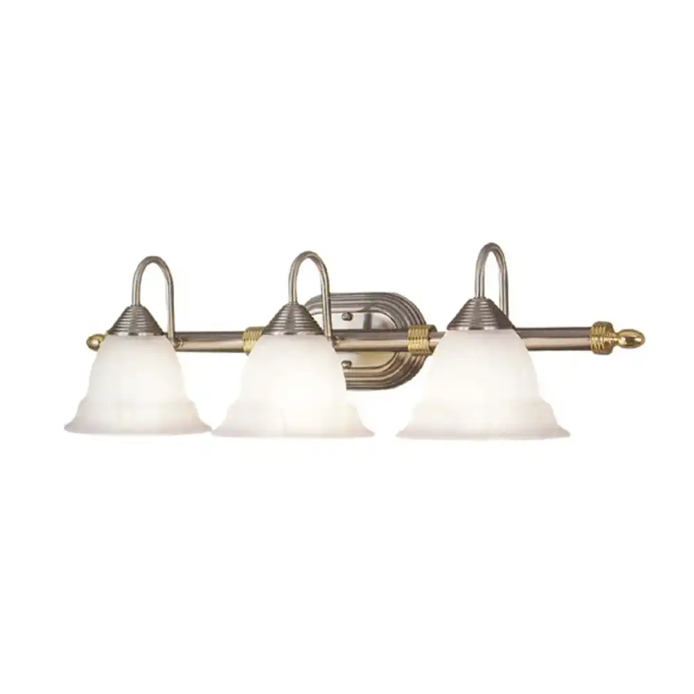 This three-light wall fixture is constructed from robust, high-strength metal, ensuring a stable and sturdy structure that is built to withstand the test of time. The distinguished brushed nickel finish, with its clean, contemporary aesthetic, is beautifully accented by subtle brass elements, creating a versatile look that complements a wide range of color palettes and design schemes. This elegant combination, featuring a straightforward horizontal bar and simple hardware, creates a sleek and modern presence. Three gracefully curved arms extend to support bell-shaped faux alabaster glass shades, which diffuse light softly and evenly, casting an inviting, ambient glow perfect for vanity areas, master bathrooms, or as an accent in hallways. The natural-looking veining in the glass adds to its luxurious appeal.