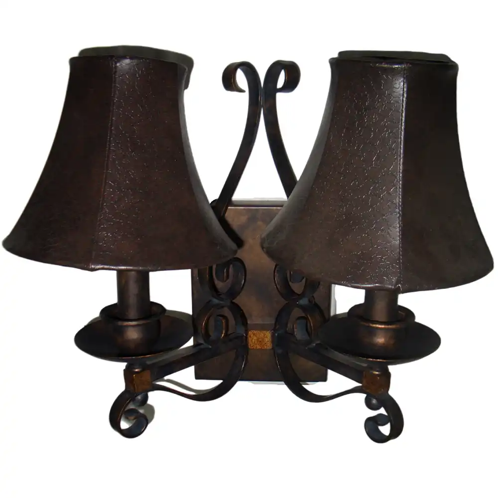 This two-light wall sconce is constructed from robust, high-strength metal, ensuring a stable structure that is built to withstand time and provide long-term compatibility. The distinguished hand-forged bronze finish offers a deep, textured dark brown with subtle highlights, providing an authentic, hand-wrought aesthetic that complements traditional decor and natural elements. This durable finish, combined with the ornate rectangular backplate, the gracefully scrolled arms and supports, and the two prominent bell-shaped leatherette shades, creates an artistic and powerful presence. The leatherette shades, with their unique texture, direct light downwards (bulbs not included), providing focused illumination perfect for creating an intimate and elegant ambiance.