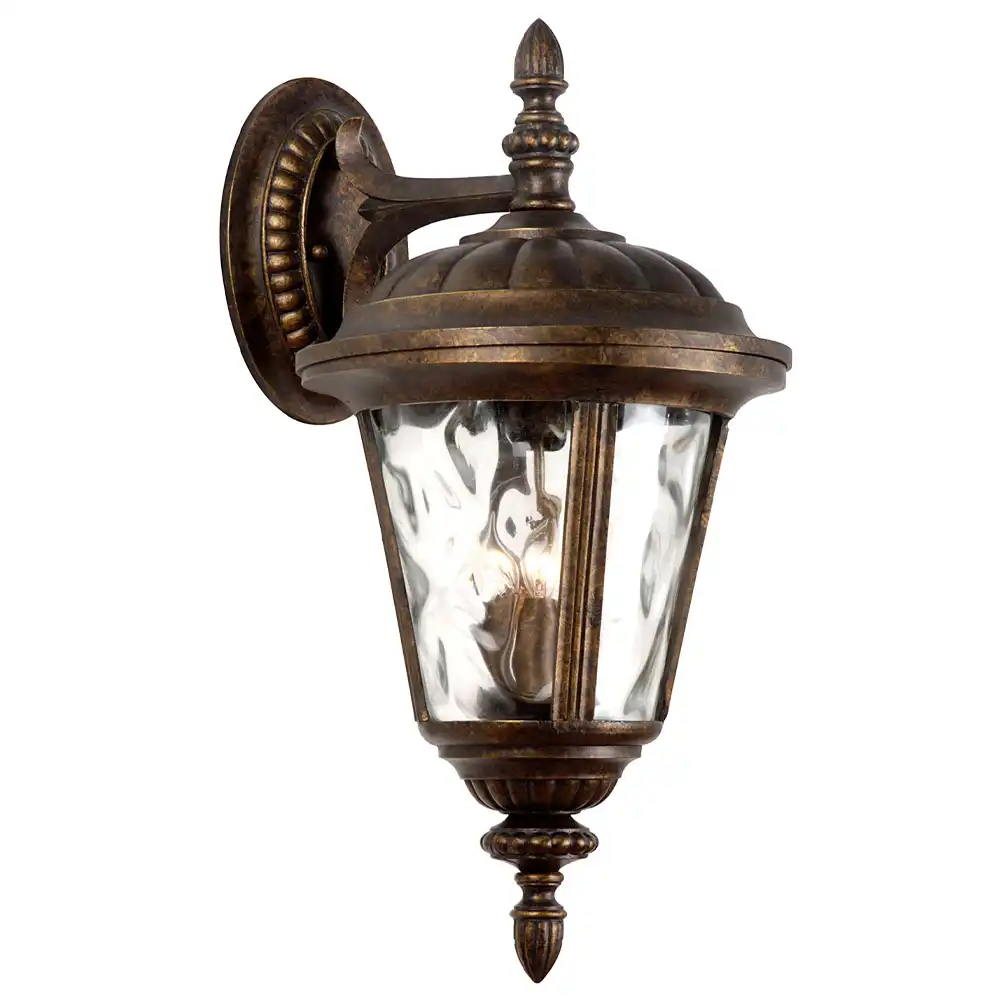 This single-light outdoor wall lantern is constructed from robust, high-strength metal, ensuring a stable structure that is built to withstand the elements and provide long-term compatibility. The distinguished aged bronze finish offers a rich, dark tone with subtle bronze and golden highlights, providing an authentic, time-worn appeal that complements a wide range of exterior color palettes and architectural styles. This durable finish, combined with the elegantly ribbed wall plate, decorative arm, domed top, and ornate top and bottom finials, creates an artistic and grand presence. The captivating water glass panels provide a unique, shimmering texture that beautifully diffuses light while showcasing the single bulb (not included), creating a warm, inviting glow perfect for entryways, porches, or patio areas.