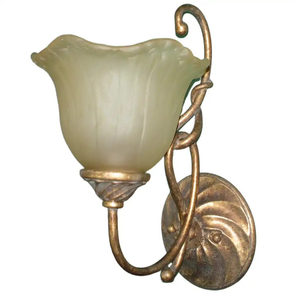 This single-light wall sconce is constructed from robust, high-strength metal, ensuring a stable structure that is built to withstand time and provide long-term compatibility. The distinguished hand-applied antique gold and bronze finish offers a rich, layered appearance, with warm golden highlights and deeper bronze undertones, providing an opulent and time-honored aesthetic. This durable finish, combined with the classic round backplate, the artistically twisted and scrolled arm resembling a winding vine, and the prominent amber-toned frosted, scalloped glass bell shade (bulb not included), creates an artistic and welcoming presence. The beautifully shaped and colored glass shade diffuses the light, creating a soft, luminous, and inviting ambient glow that is perfect for enhancing a cozy and stylish atmosphere.
