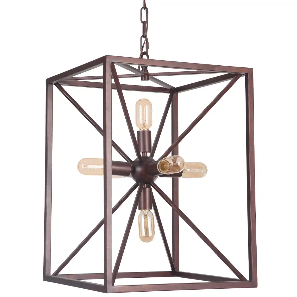 The chandelier features a sturdy, open cubic cage design, meticulously crafted from high-strength metal. The entire metal framework, including the suspension chain, boasts a rich, multi-layered rubbed bronze finish. This finish is characterized by a deep, dark brown base with subtle, almost reddish-copper undertones and deliberate lighter highlights on the edges and raised surfaces, giving it an authentic, hand-aged, distressed appearance. This nuanced treatment adds significant depth and character, allowing the fixture to seamlessly integrate into spaces that embrace raw materials and a sophisticated, unpolished aesthetic.
