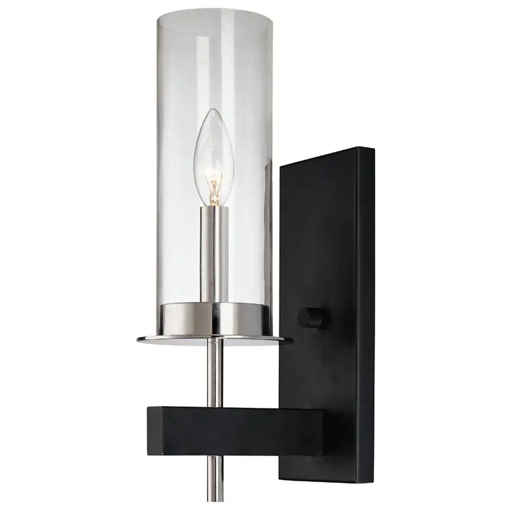This single-light wall sconce is constructed from robust, high-strength metal, ensuring a stable structure that is built to withstand time and provide long-term compatibility. The striking matte black finish provides a bold, contemporary foundation, offering a sophisticated contrast to the gleaming polished chrome components. This durable finish, combined with the clean lines of the rectangular backplate and horizontal accent bar, the slender chrome bulb base, and the prominent clear glass cylinder shade, creates an artistic and powerful presence. The clear glass shade allows for maximum, unobstructed light (bulb included as shown, ideal for a decorative candelabra or flame-tip bulb), perfect for task lighting in a vanity area or providing ambient light in a living space.