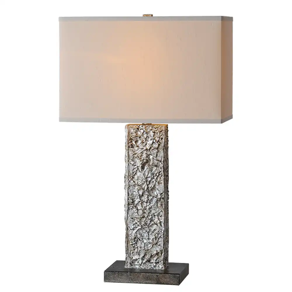The lamp’s substantial base is meticulously crafted from high-strength metal, boasting a unique, deeply textured finish reminiscent of weathered stone or ancient bark. This remarkable surface is then hand-finished in a sophisticated distressed silver or pewter tone, enhancing its three-dimensional quality and providing a rich visual depth. This robust construction ensures a stable structure and long-term compatibility, making it a durable and enduring addition to your decor. The rectangular base provides a solid anchor, grounding the lamp with a confident presence.