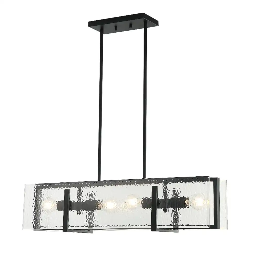 Flanking both sides of the frame are clouded glass panels that run parallel to the frame, softly diffusing the illumination and adding visual depth and sophistication. The glass texture introduces a handcrafted aesthetic that contrasts beautifully with the matte black metal structure, making this pendant an excellent fit for modern interiors with minimalist or transitional themes.