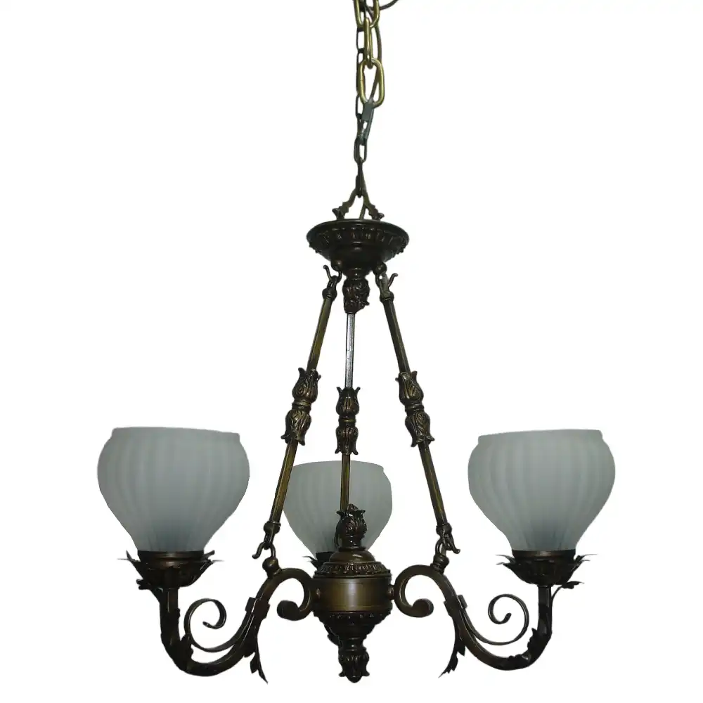From this central cone, three rectangular stems descend, connected via sleek hooks to gracefully curved S-shaped rectangular tubes—each elegantly adorned with metal leaf details. These tubes converge on a spindle-shaped accent, precisely welded to maintain matching curvature.