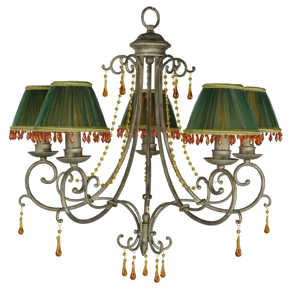 Each gracefully scrolled arm supports a candle-style holder topped with a pleated green fabric shade, delicately trimmed with golden braid and finished with amber bead fringe. Complementing this design are amber crystal teardrops and golden bead strands, which cascade from the frame and finials, catching light beautifully for a warm, jewel-like glow.