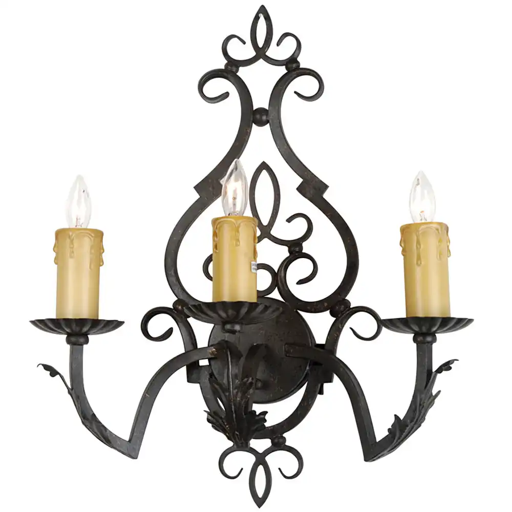 This three-light wall sconce is constructed from robust, high-strength metal, ensuring a stable structure that is built to withstand time and provide long-term compatibility. The distinguished hand-applied wrought iron finish offers a deep, matte black with subtle distressed highlights, providing a rich, antique aesthetic that complements classic decor and opulent color palettes. This durable finish, combined with the intricately detailed backplate featuring open scrollwork and a central leaf motif, and the gracefully curved arms supporting the three candle-style bulb bases, creates an artistic and powerful presence. Designed to use candelabra bulbs (not included), it casts a direct, warm glow, reminiscent of traditional candlelight, perfect for enhancing a sumptuous and elegant atmosphere.