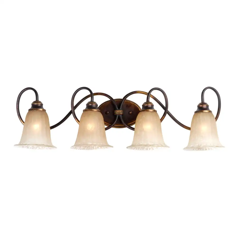 Introduce a touch of timeless artistry and expansive, warm illumination to your interiors with our Wrought Iron Serenade 4-Light Vanity Light with Scrolled Arms & Frosted Fluted Glass. Meticulously handcrafted at our professional decorative light fixture factory in China, this exquisite wall lighting piece embodies a profound understanding of traditional, rustic, Tuscan, and transitional interior design. It seamlessly blends high-strength metal with a rich distressed bronze finish, intricate open scrollwork, and four beautifully frosted, subtly fluted glass shades. Designed for enduring beauty, stability, and long-term reliability, it’s an ideal selection for discerning designers and end-users seeking distinctive, artistic, and functionally superior lighting solutions for expansive bathrooms, grand hallways, or large living spaces.